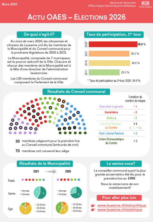 Au lendemain des élections communales, l’Office d’appui économique et statistique (OAES) de la Ville de Lausanne met en ligne une infographie consacrée aux résultats de la législature 2026–2031.