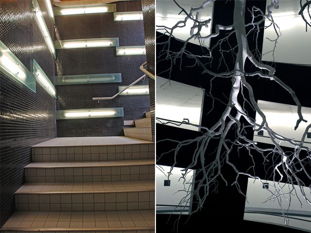 A l’intérieur, la lisibilité des volumes est accentuée par la dissimulation des éléments techniques et l’absence d’obstacles au sol, apportant confort visuel et de conduite. L’espace est animé d’une unique rangée de piliers dont les profils reflètent la lumière tout en réduisant l’emprise au sol à son minimum. Les rampes cylindriques bénéficient également d’un dessin soigné. Au centre de l’une d’elle, un arbre suspendu à l’envers, oeuvre de l’artiste Daniel Schlaepfer, évoque la perte de repère que provoque l’absence de lumière du jour. Le parking a obtenu la Distinction romande d’architecture en 2006.