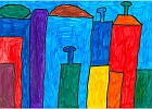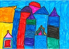Toujours inspirés par le travail sur l'architecture et l'urbanisme, nous avons travaillé le tracé des formes, l'utilisation de l'espace et la création d'arrière-plans en dessinant des villages qui finalement ressemblent fort à des villes.